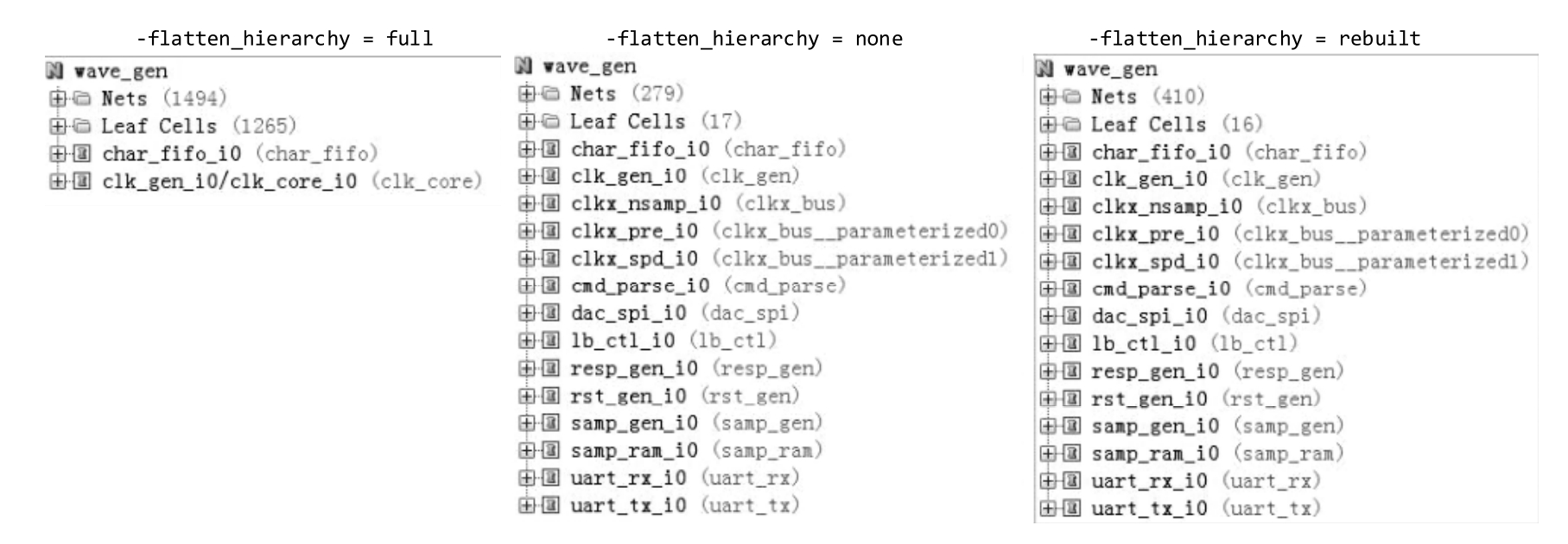 图2.3 -flatten_hierarchy为不同值时综合后的网表层次