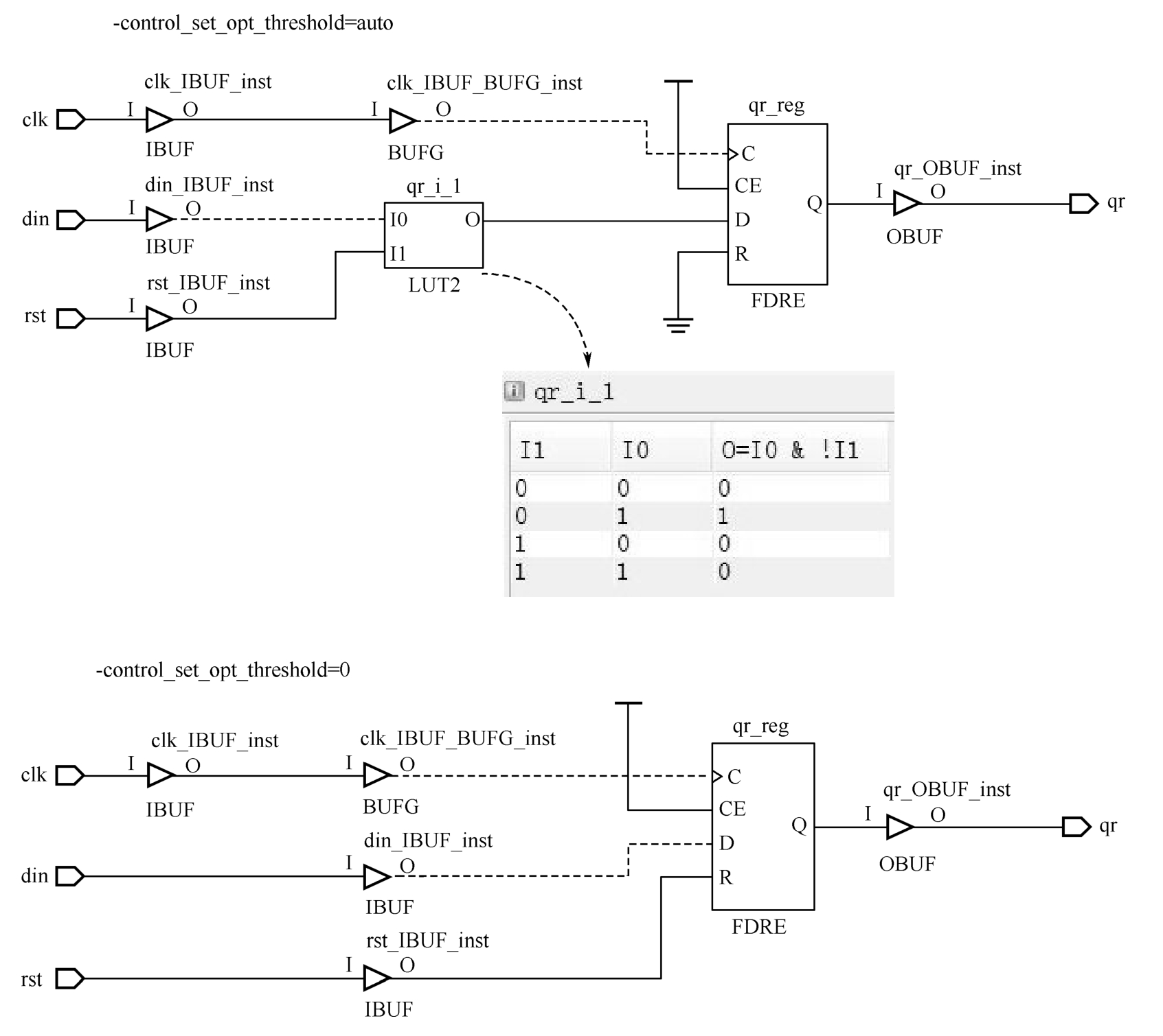 对于VHDL代码2.6所示的同步复位寄存器,-control_set_opt_threshold取auto和0时的综合结果如图2.17所示。