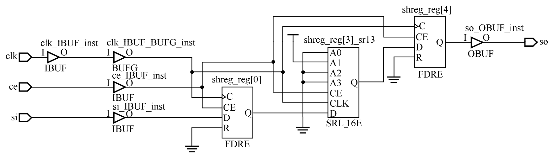 在第1章已阐述了SLICEM中的LUT可以用来实现移位寄存器。-shreg_min_size决定了当VHDL代码2.8所示的移位寄存器的深度大于此设定值时,将采用“触发器+SRL+触发器”的方式实现,其中SRL由LUT实现。例如,当DEPTH=5时,综合后的结果如图2.19所示。