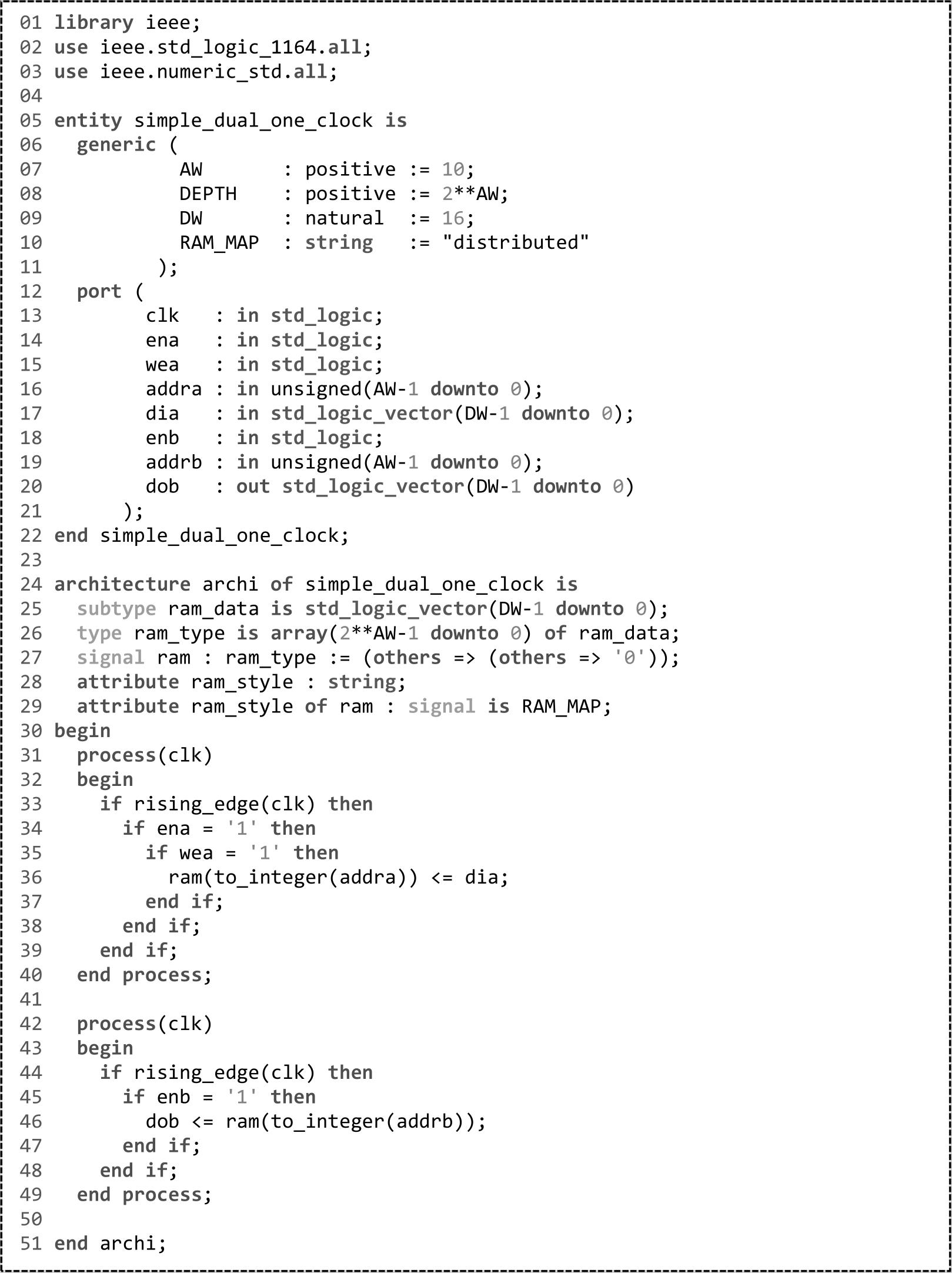 VHDL代码2.11描述的是一个时钟的简单双端口RAM可以通过ram_style映射为分布式资源,其中RAM_MAP(在generic中声明)的值为distributed,采用这种方法是为了实现综合属性的参数化管理。