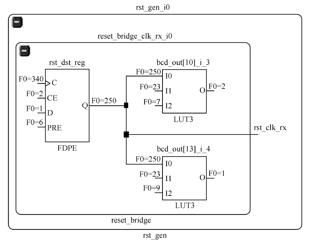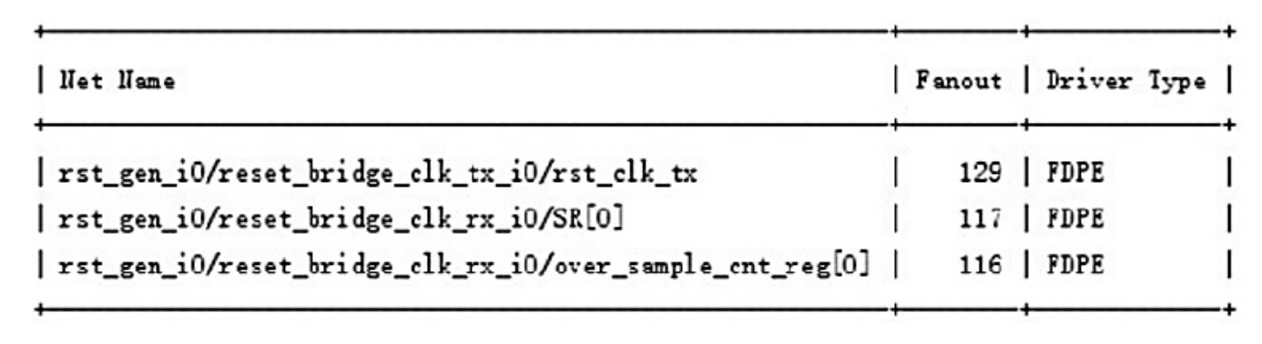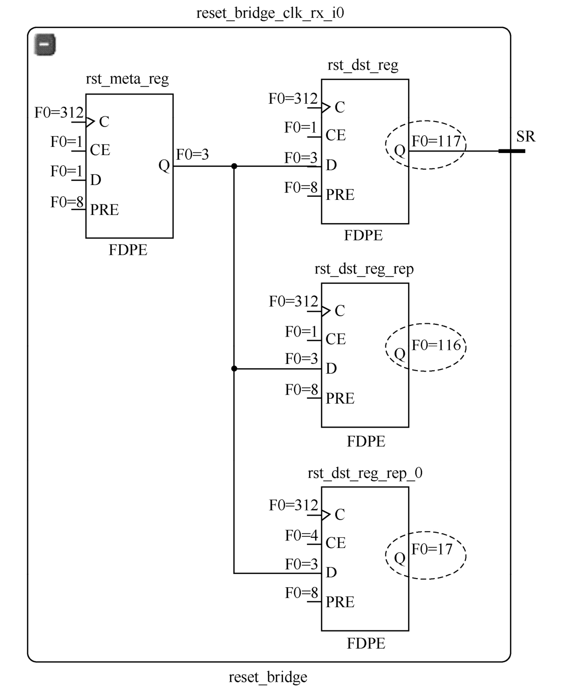 综合后再次通过report_high_fanout_nets命令找到扇出较大的网线,如图2.25所示,可以看到,此时rst_clk_rx的扇出已经降低。为了进一步确定,可观察其Schematic视图,如图2.26所示。显然,此时rst_clk_rx已经被赋值为3个寄存器,每个寄存器的扇出分别为117、116和17,总扇出保持不变。
