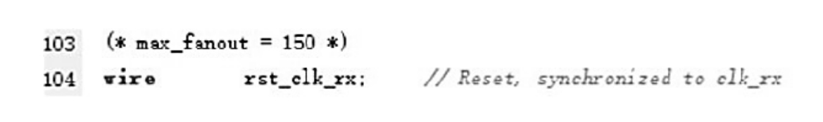 为了将rst_clk_rx的扇出降低到150,在原始的HDL代码中使用max_fanout(注意,括号和星号之间没有空格),如图2.24所示。