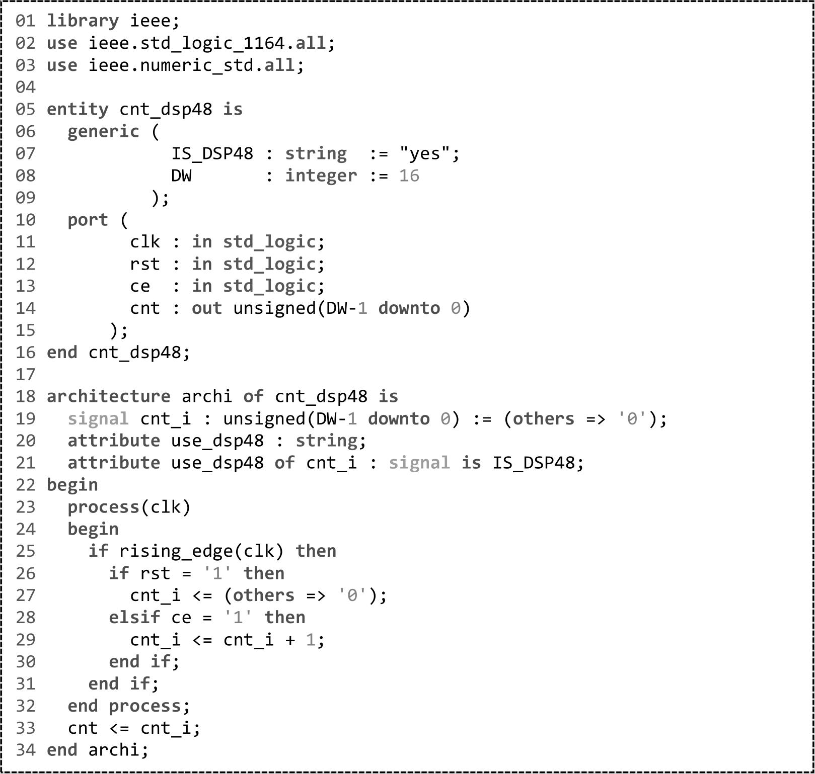 对于FPGA设计中常用的计数器,也可以采用use_dsp48属性使其映射到DSP48上,如VHDL代码2.13所示。代码中IS_DSP48的值为yes。