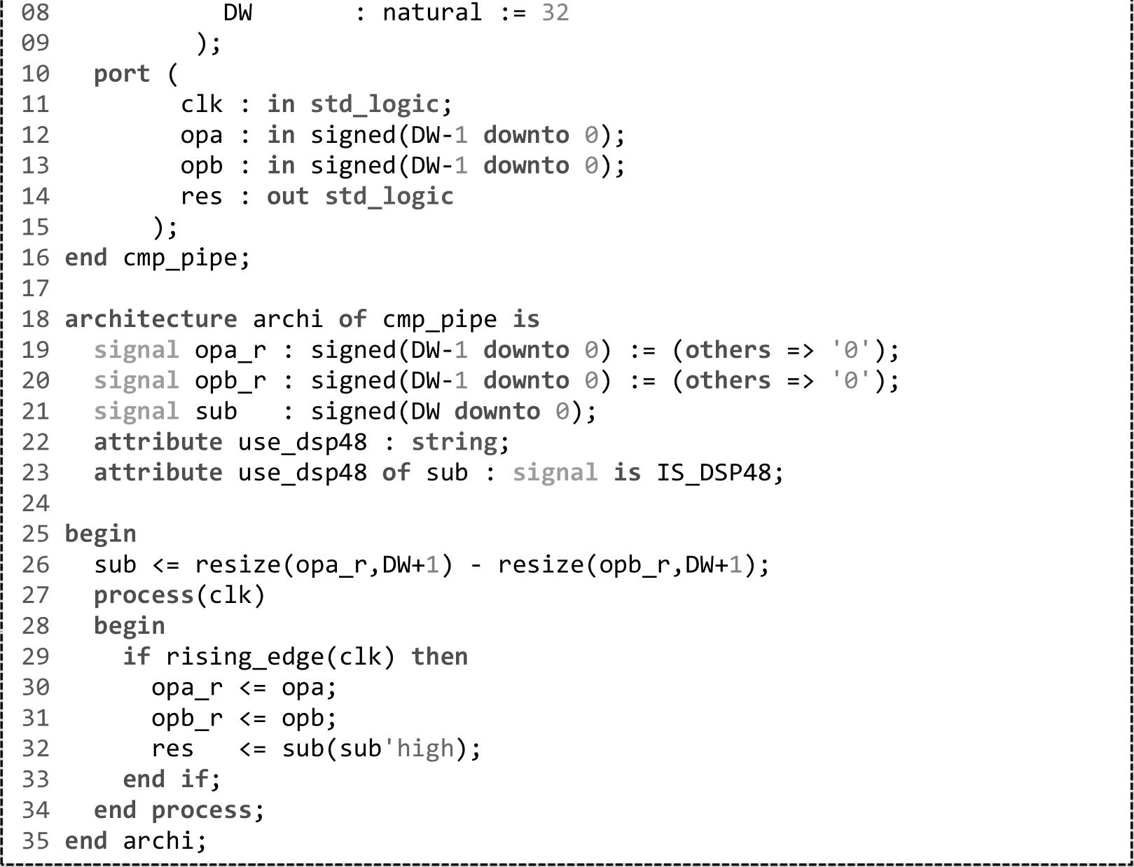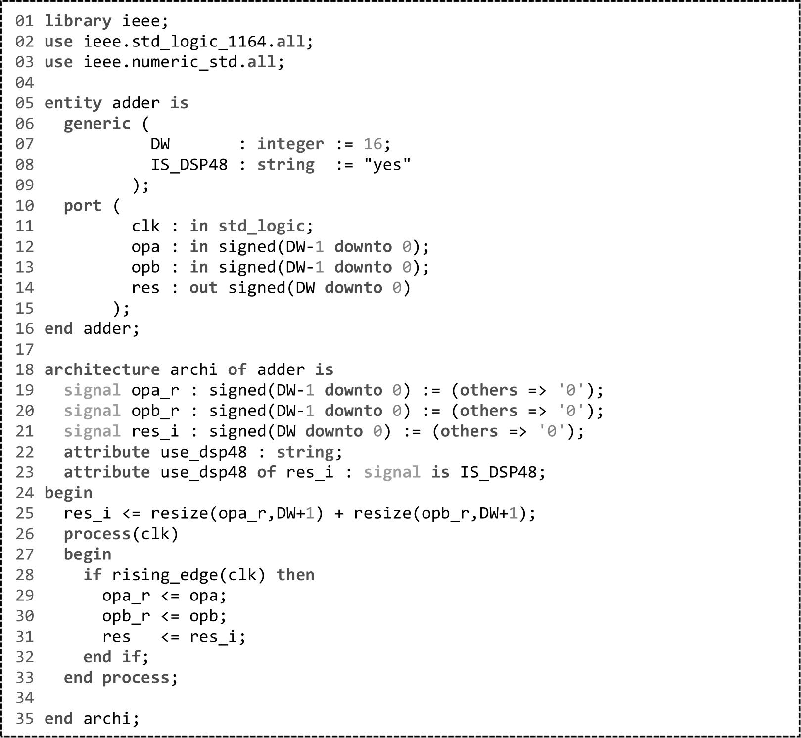采用VHDL描述加法运算并使用该属性的相应代码,如VHDL代码2.12所示。综合后,该模块只占用了一个DSP48E1(目标芯片为7系列FPGA),其中的寄存器也一并被吸收到DSP48E1内部。