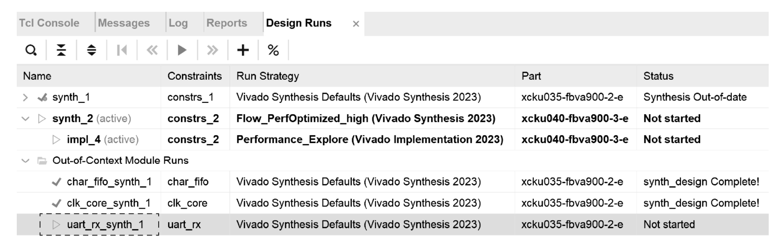 对于uart_rx_ooc.xdc文件,打开之后,内容为空,添加如Tcl脚本2.1所示的时钟约束,之后即可对uart_rx模块单独进行综合。注意,uart_rx_ooc.xdc并不需要添加到Vivado工程中,它会和图2.34中的uart_rx_synth_1自动关联起来,如图2.35所示。