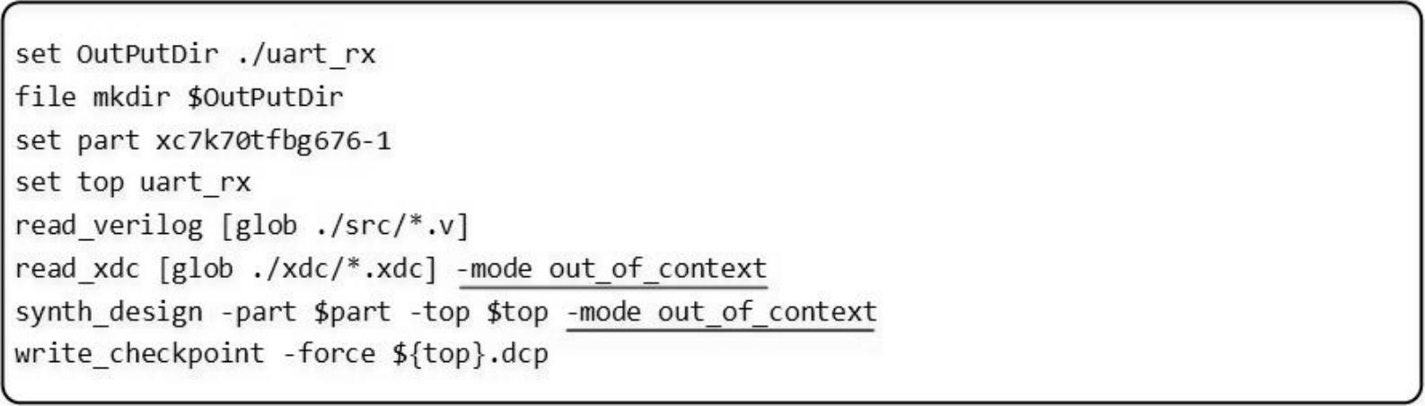 在Tcl脚本2.2中,需要注意,读入xdc时要以out_of_context模式读入,综合时也要指定综合模式为out_of_context,如脚本中的下画线部分所示。