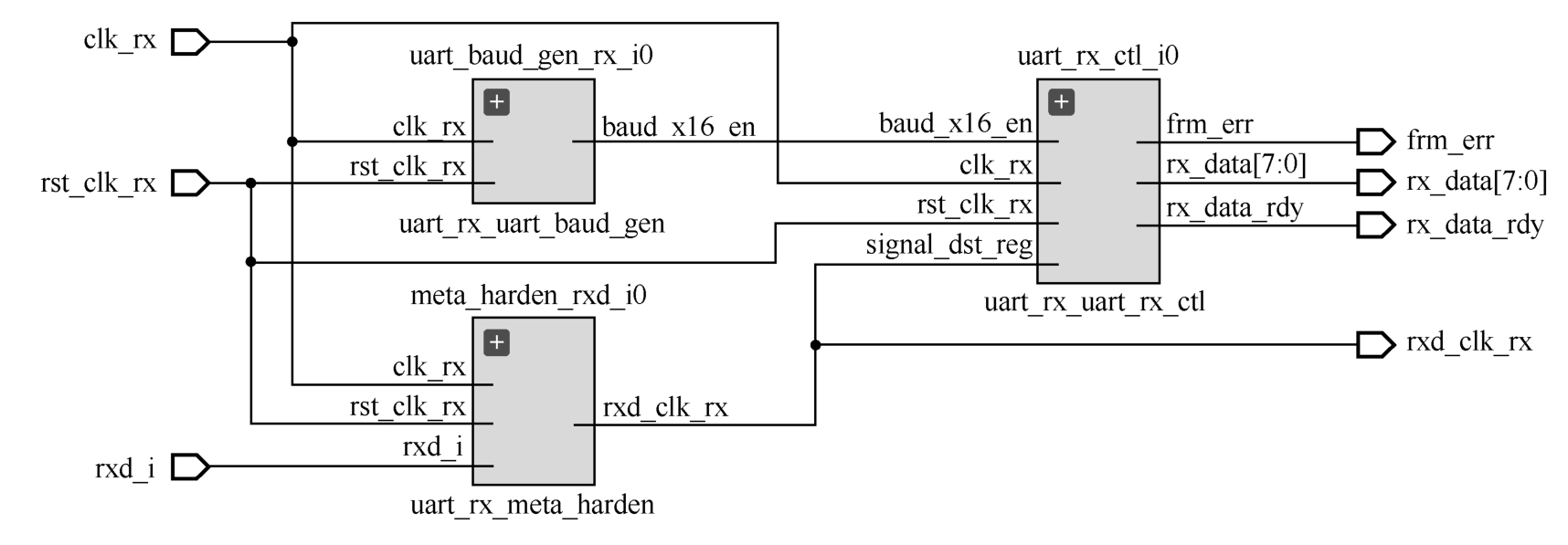 对于uart_rx_synth_1,打开运行结果,可以看到如图2.37所示的Schematic视图。此视图中,输入/输出引脚并没有插入I/O BUF。之后,可对该模块单独进行时序分析。