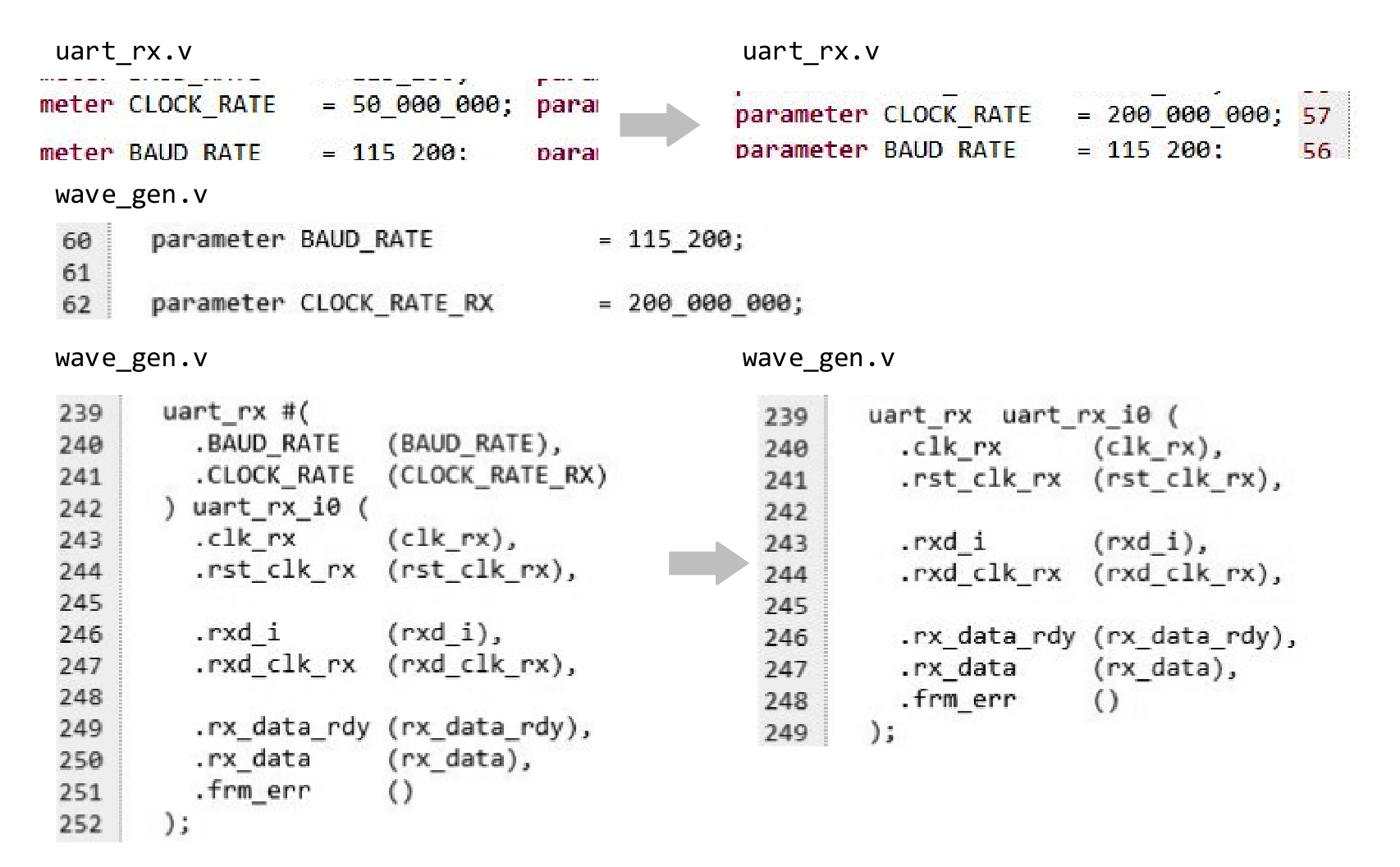 (2)在顶层wave_gen.v中对uart_rx.v模块实例化时移除参数传递,如图2.31右侧所示。