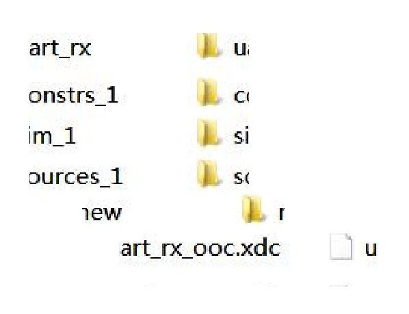 在Non-Project模式下,使用OOC也非常容易操作。仍以Wavegen工程为例,需要将其中的uart_rx模块应用OOC综合模式。首先创建src文件夹,将相应的Verilog文件复制到该目录下,同时创建xdc文件夹和uart_rx_ooc.xdc文件,其中.xdc的文件内容为clk_rx的时钟周期约束,与Tcl脚本2.1一致。整体目录如图2.39所示。