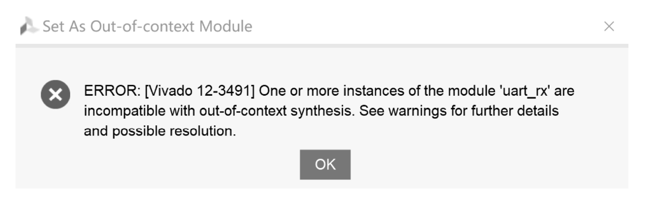 单击OK按钮之后,会出现如图2.29所示界面,显示设定OOC失败,并在Tcl Console窗口中给出CRITICAL WARNING(如图2.30所示)。注意其中加粗的斜体字,表明失败原因是实例化uart_rx时出现了参数传递。