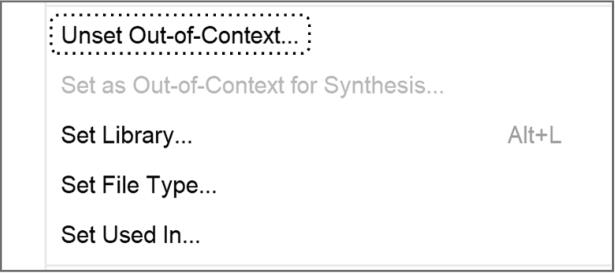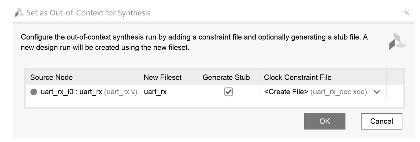 仍以Vivado自带的例子工程Wavegen为例。设定工程名为WaveGenOOC,打开该工程之后,选中uart_rx模块,单击右键就会出现如图2.27所示的界面,选择图中方框标记的选项,会弹出如图2.28所示的界面。在此界面中,Source Node指定了被设定为OOC综合的模块,Generate Stub的作用是告知Vivado在对顶层设计综合时,需要把uart_rx模块当作黑盒子(Black Box)对待(因为其在OOC模式下已被单独综合,有单独的网表文件)。