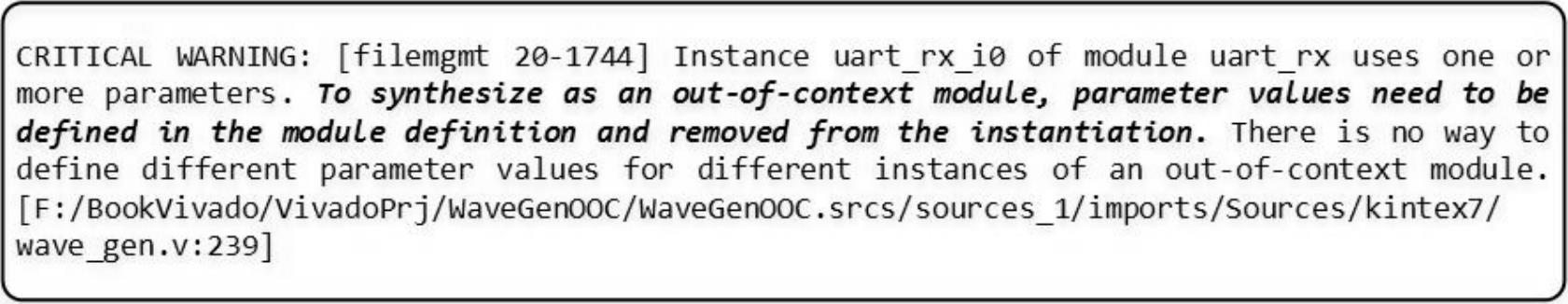 进一步分析,在uart_rx.v中定义了两个参数,如图2.31左侧所示,在顶层wave_gen.v中对这两个参数重新定义并在uart_rx.v实例化时执行参数传递,而这对于需要OOC综合的模块而言是不允许的。因此,做如下两点改动: