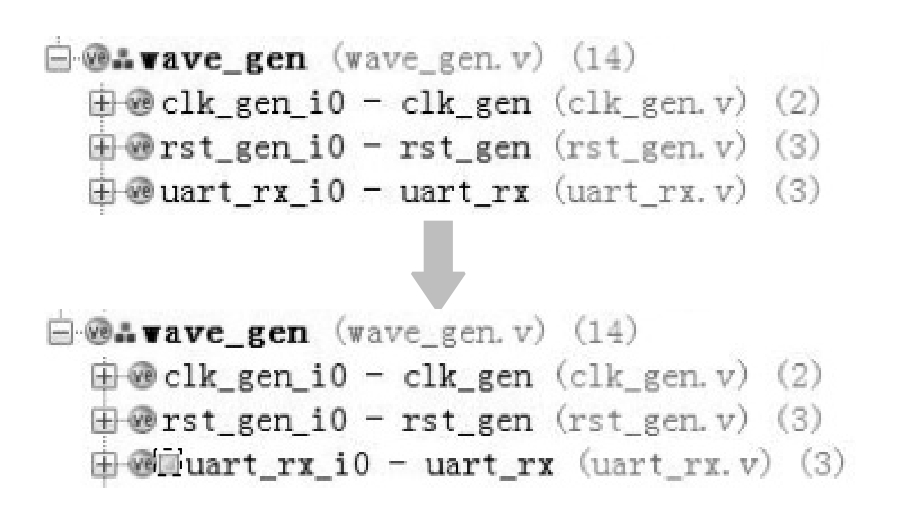 (2)在顶层wave_gen.v中对uart_rx.v模块实例化时移除参数传递,如图2.31右侧所示。