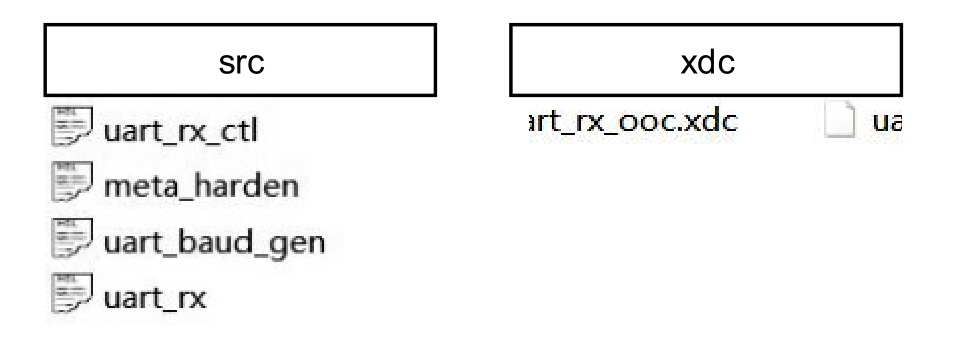 在Non-Project模式下,使用OOC也非常容易操作。仍以Wavegen工程为例,需要将其中的uart_rx模块应用OOC综合模式。首先创建src文件夹,将相应的Verilog文件复制到该目录下,同时创建xdc文件夹和uart_rx_ooc.xdc文件,其中.xdc的文件内容为clk_rx的时钟周期约束,与Tcl脚本2.1一致。整体目录如图2.39所示。