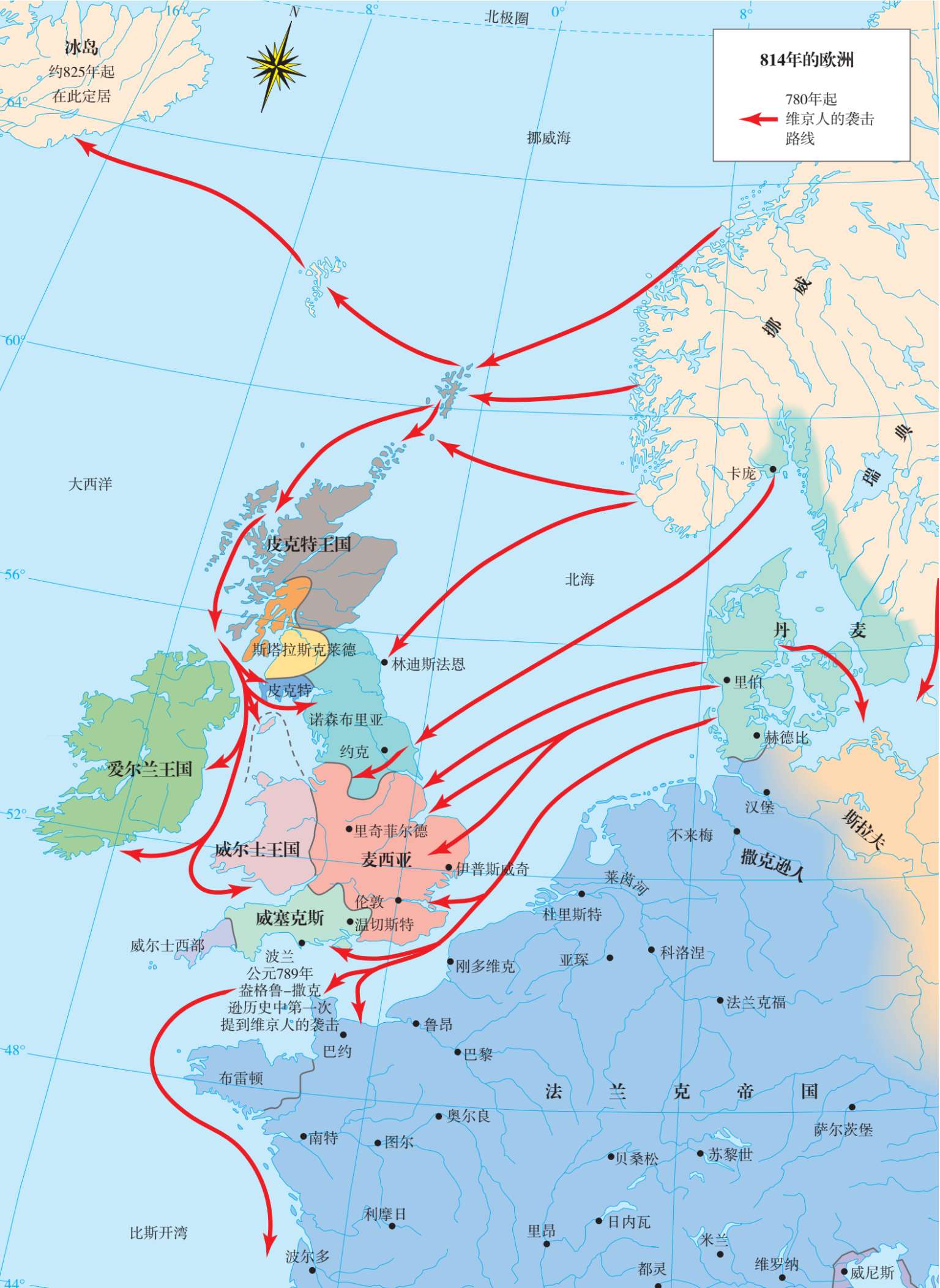 789年,也就是林迪斯法恩遇袭事件发生的前几年,三艘“维京”(可能是挪威人的)船只驶入了韦茅斯(Weymouth),当时人们普遍认为这只是一次贸易探险。但一场与当地官员的争执演变成了一场打斗,继而演变成了一场刀斧相向的殊死搏斗。虽然那时这个事件被描述成维京人对港口的一次袭击,但很可能更像是一次意外的国际事件——与外国水手发生冲突在当时并不罕见。海盗袭击沿海定居点的事件经常发生,而且他们冒险沿河而上袭击内陆城镇的情况也并非没有。卷入韦茅斯事件的“商人”很可能当时正在进行贸易远航,但这并不意味着他们没有在其他场合进行过袭击。这种主题在整个维京时代反复出现。身强力壮、全副武装的人驾驶着适于航海的船只,有能力开展和平的探险和贸易,但也能进行野蛮的掠夺和抢劫。在某些情况下,他们在特定时间从事哪种活动可能只是个人偏好的问题,但更多时候则取决于哪种活动更有利可图。
