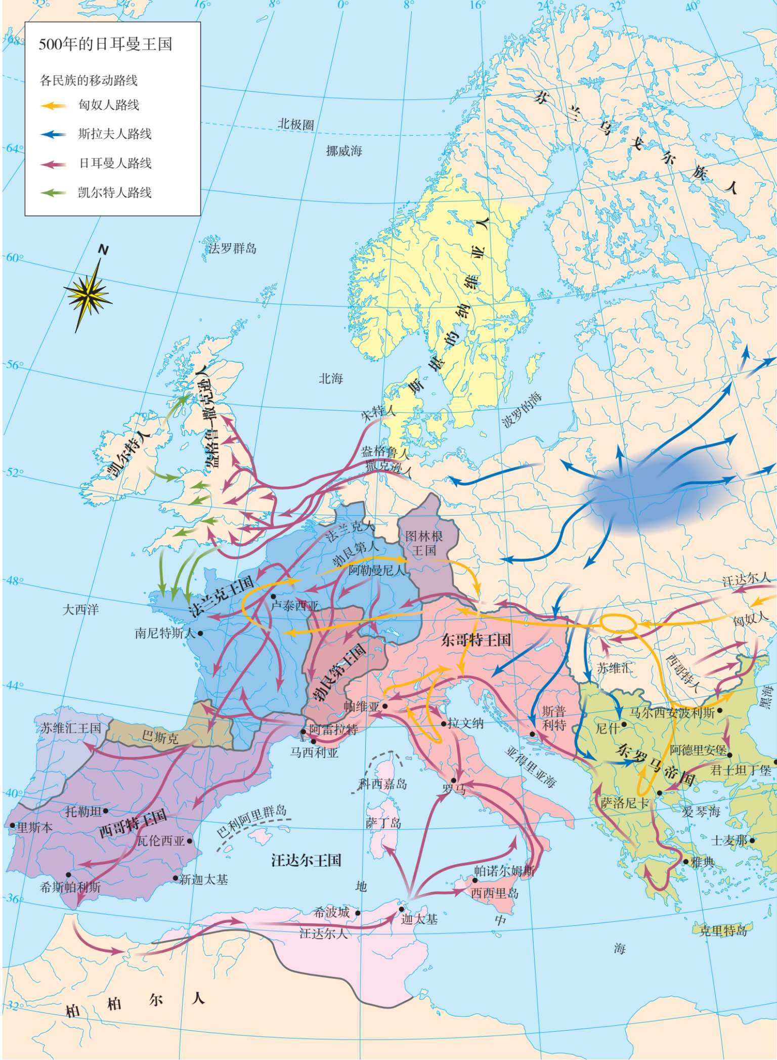这一时期被称为移民时期,这一时期里所产生的动荡持续了几个世纪。到了8世纪,欧洲出现了一种新的秩序,强大的墨洛温王朝(Merovingian Dynasty)控制了原高卢(Gaul)的大部分地区。斯堪的纳维亚半岛没有像欧洲大部分地区那样受到匈奴人入侵的严重影响,继续保持着相对稳定的局面。稳定可以带来贸易,进而带来繁荣。