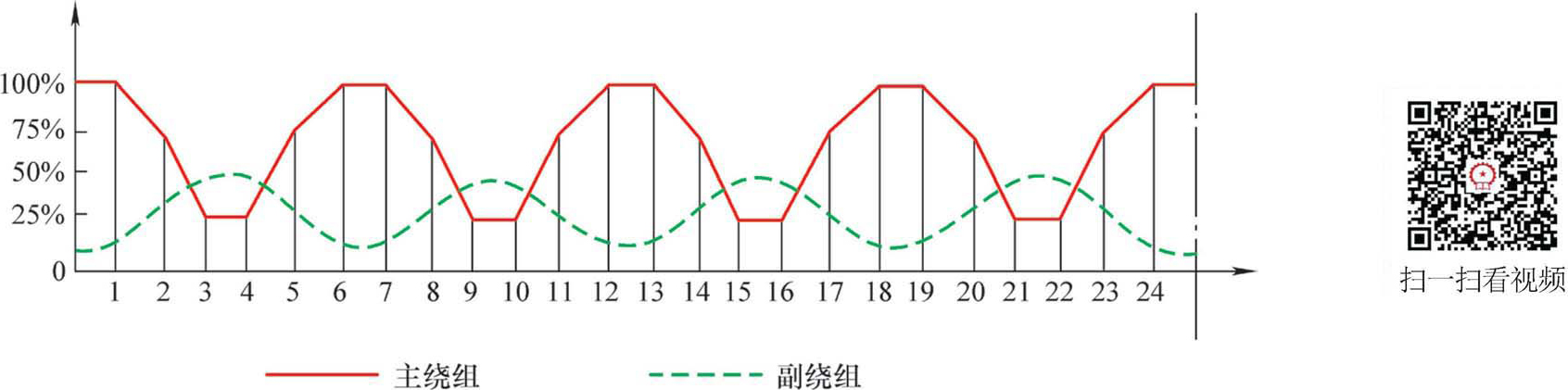 图2-10是以百分数表示的正弦绕组各槽导体分布图(图中将主绕组槽内导体数最多的作为100%),与之对应的正弦绕组展开图如图2-11所示。当同一槽内嵌有主、副绕组两个线圈的边时,一般 将主绕组放置在槽的下层,将副绕组放置在槽的上层,上、下层之间应垫入层间绝缘。