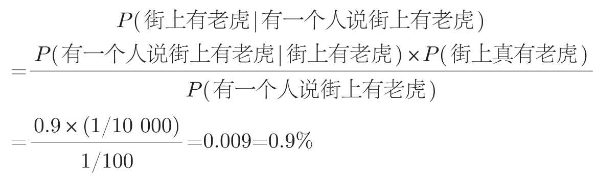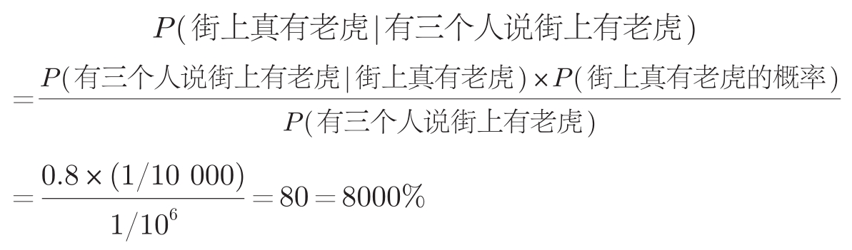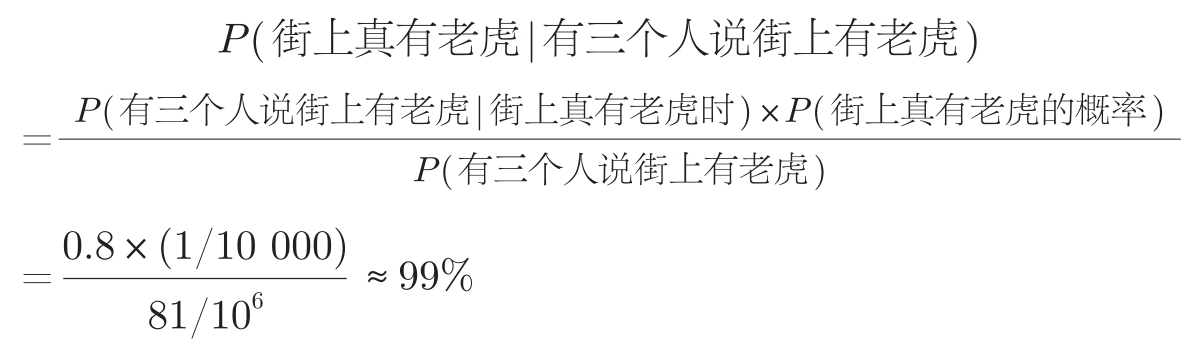 这个数字非常小,说明那个人很可能只是开玩笑,而街上根本没有老虎。但“三人”为什么就“成虎”了呢?如果我们能知道:某天有三个人跟你说街上有老虎的概率,那么我们同样可以根据贝叶斯定理,算出街上真有老虎的概率。