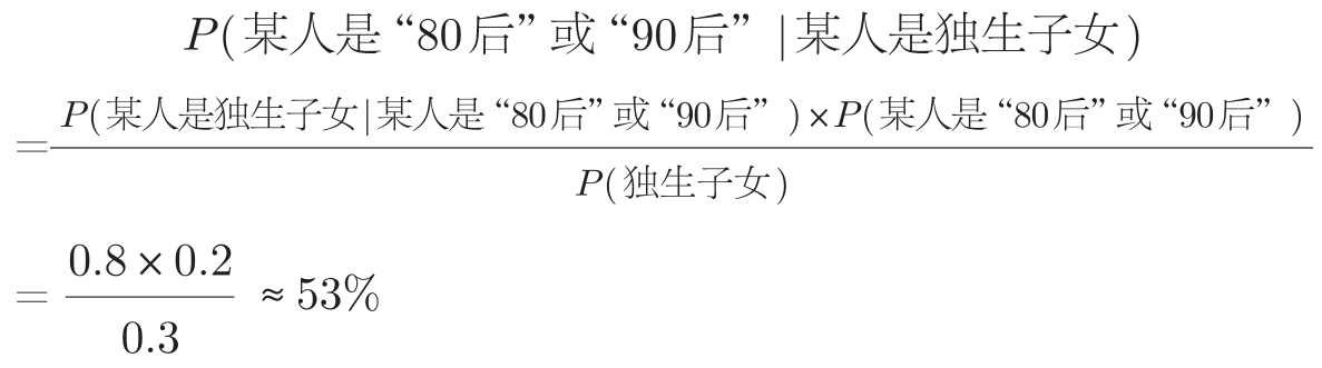 之前已假定: P (某人是独生子女|某人是“80后”或“90后”)=80%, P (独生子女)=30%。此处我们还需要知道 P (某人是“80后”或“90后”),即“80后”或“90后”占全体人口的比例,我假定它是20%。那么代入公式,得到: