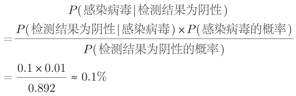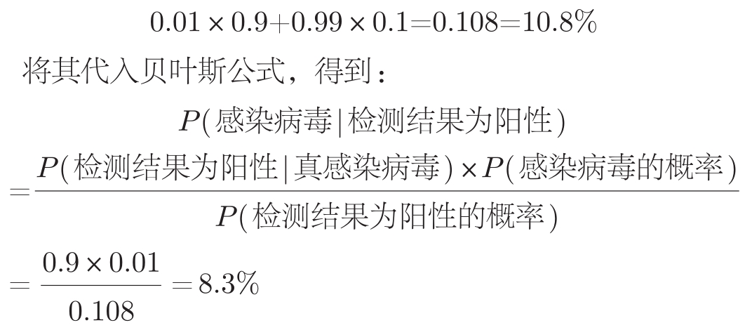 这就是说,当检测结果是阳性时,有超过90%的概率是假阳性,这是不是反直觉?从计算过程中看出,这个结果的反直觉原因在于,我们假设这个病毒的一般感染率是1%,这仍然是一个比较小的数值,以至于检测结果为阳性时,这个证据并不能很好地证明感染病毒这个事实。