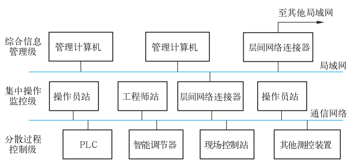图1-2是一个典型集散控制系统的结构示意图,系统包括 分散过程控制级、集中操作监控级和综合信息管理级 ,各级之间通过网络互相连接。分散过程控制级主要由PLC、智能调节器、现场控制站及其他测控装置组成,是系统控制功能的主要实施部分;分散过程控制级直接面向工业对象,完成生产过程的数据采集、闭环调节控制、顺序控制等功能;并可与上一级的集中操作监控级进行数据通信。通信网络是DCS的中枢,它将DCS的各部分连接起来构成一个整体,使整个系统协调一致地工作,从而实现数据和信息资源的共享,是实现集中管理、分散控制的关键。集中操作监控级包括:操作员站、工程师站和层间网络连接器等,可实现系统操作、组态、工艺流程图显示以及监视过程对象和控制装置运行情况的功能,并可通过通信网络向过程控制级设备发出控制和干预指令。综合信息管理级由管理计算机构成,主要是指工厂管理信息系统,作为DCS更高层次的应用,它可以实现监视企业各部门的运行情况、完成生产管理和经营管理等功能。