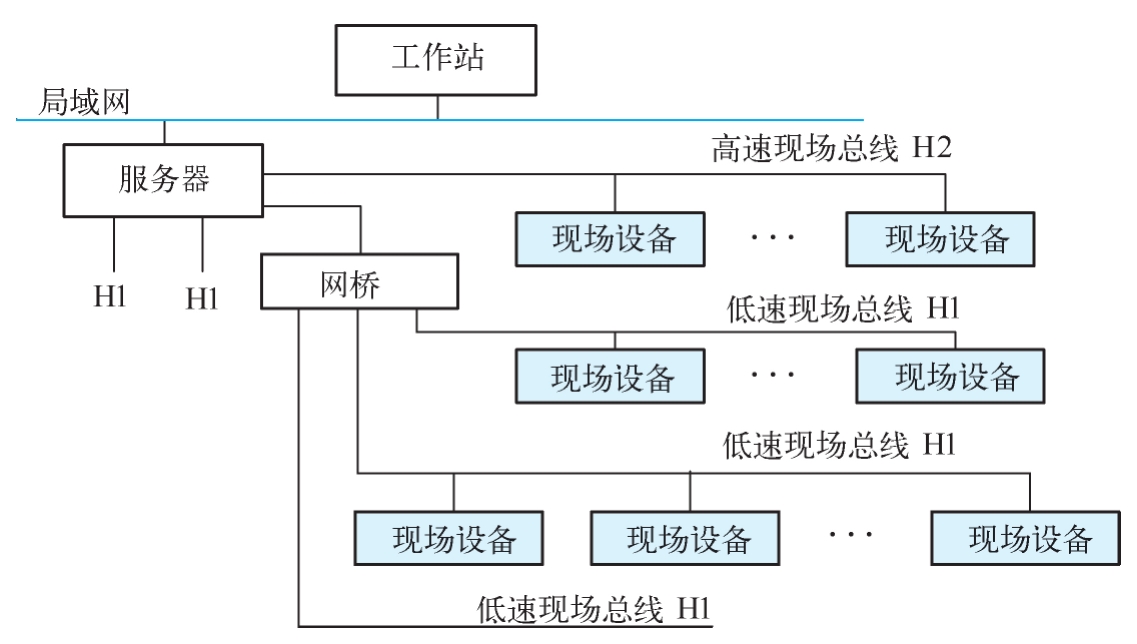 现场总线控制系统的结构示意图如图1-3所示。 现场总线作为智能设备的纽带 ,将挂接在总线上、作为网络节点的智能设备相互连接,构成相互沟通信息、共同完成自动控制功能的网络系统与控制系统。生产现场控制设备之间、控制设备与控制管理层网络之间通过这样结构的连接和通信,系统更加灵活和开放,为彻底打破自动化系统的信息孤岛创造了条件,使得设备之间以及系统与外界之间的信息交换得以实现,促进了自动控制系统朝着网络化、智能化的方向发展。它给自动化领域带来的变化,如同计算机网络给计算机的功能、作用带来的变化一样。 如果说计算机网络把人类引入到信息时代,那么现场总线则使自控系统与设备加入到信息网络的行列,成为企业信息网络的底层,使企业信息沟通的范围一直延伸到生产现场。 因此,可以说现场总线技术的出现标志着一个自动化新时代的开端。