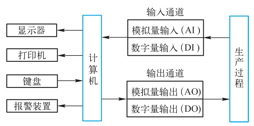 图1-1为直接式数字控制系统示意图。 计算机与生产过程之间的信息传递是通过生产过程的输入/输出设备进行的。 过程输入设备包括输入通道(AI通道、DI通道),用于向计算机输入生产过程中的模拟信号、开关量信号或数字信号;过程输出设备包括输出通道(AO通道、DO通道),用于将计算机的运算结果输出并作用于控制对象。计算机通过过程输入通道对生产现场的变量进行巡回检测;然后,根据变量,按照一定的控制规律进行运算;最后,将运算结果通过输出通道输出,并作用于执行器,使被控变量符合系统要求的性能指标。计算机控制系统由机箱、显示器、打印机、键盘及报警装置等设备组成,可以实现对生产过程的自动控制、运行参数监视、打印运行参数数据及声光报警等功能。