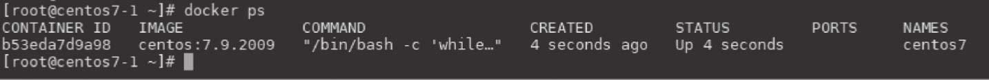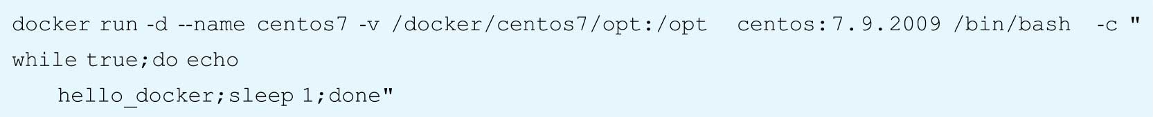 这里-d参数表示后台启动,前面的-it表示交互的方式启动。此外,这里通过-name指定容器的名称为centos7,参数-v/docker/centos7/opt:/opt是指目录挂载。所谓的目录挂载,实质就是说本地的/docker/centos7/opt目录与docker容器中的/opt目录保持一致,这样即使将容器删除,容器中/opt目录中的文件会保存在本地的/docker/centos7/opt目录中,解决了前面我们担心的容器删除后数据丢失的问题。同时,这里指定了centos镜像的tag值,在实际工作应用中,推荐大家指定具体的tag值。如果不指定tag值,直接使用latest镜像,当官方镜像更新,会导致我们启动的容器同样更新,这就有可能带来软件依赖不兼容等问题。除此以外,最后还指定了一个死循环的shell语句,这主要是为了让docker容器中能一直有程序在运行。因为如果没有程序运行,docker容器就会停止了。