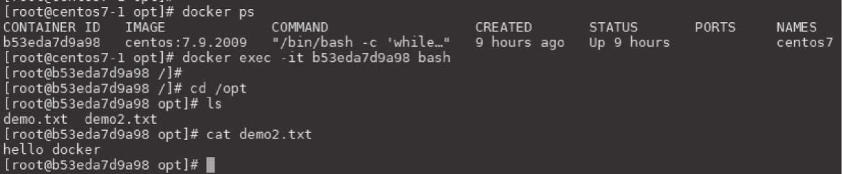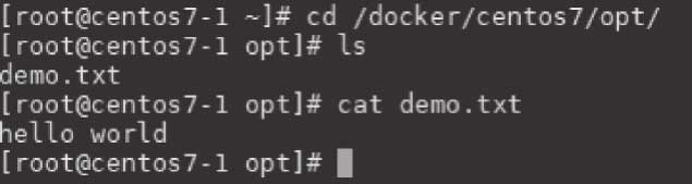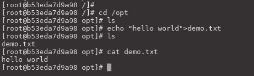 接下来进入docker容器窗口,切换到/opt目录。创建一个demo.txt,并向文件中写入hello world,如图2-61所示。