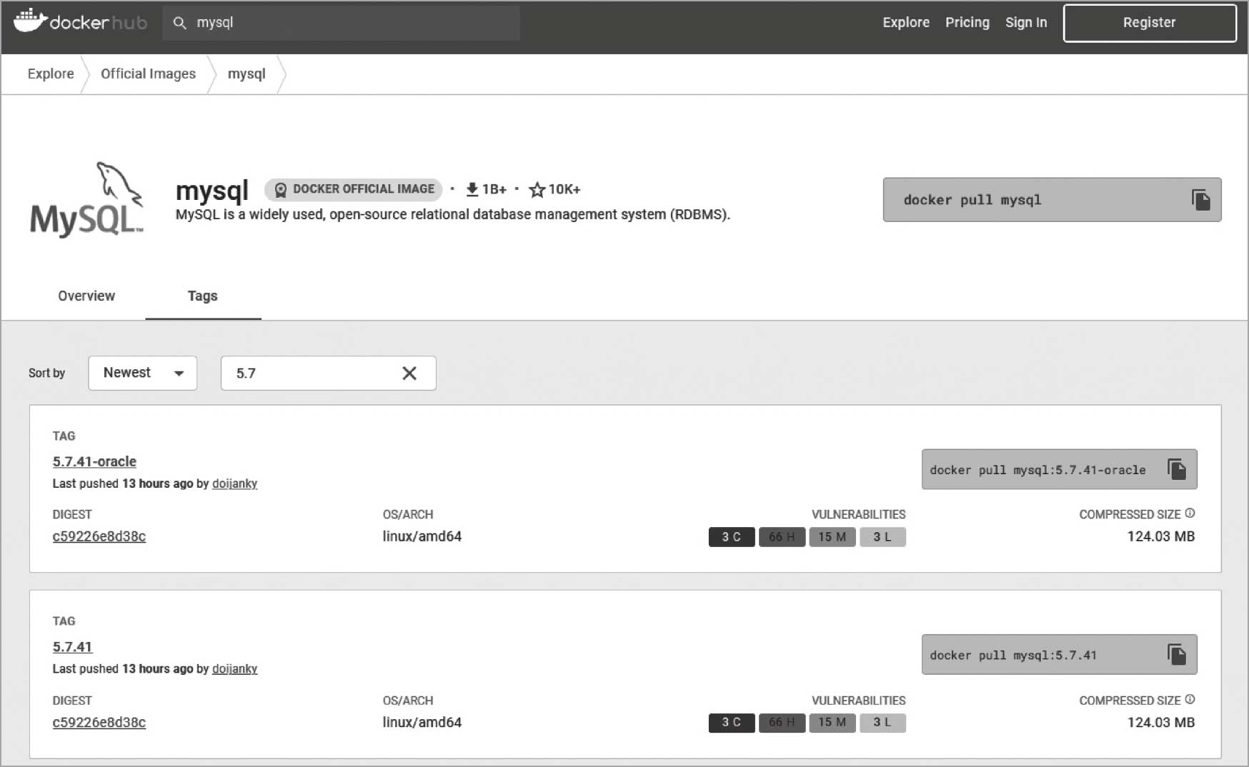 1)选择MySQL镜像的tag版本。首先到dockerhub网站查找想要部署的MySQL数据库的版本,如图2-75所示。如果我们想安装5.7版本的MySQL数据库,则在搜索关键字5.7后,发现当前比较新的是5.7.41版本,因此这里就选择5.7.41版本。