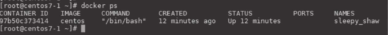 这里可以看到正在运行的docker容器的信息,如图2-55所示。第1列为docker容器的id;第2列为docker容器使用的镜像;第3列为docker容器启动后执行的命令,这里是打开了bash;第4列为docker容器创建的时间;第5列为docker容器的状态;第6列为docker容器的端口,这里还没有涉及,后面介绍开放端口的时候再详细介绍;第7列为docker容器的名字,这里因为启动命令中没有指定,因此是一个自动生成的名字。