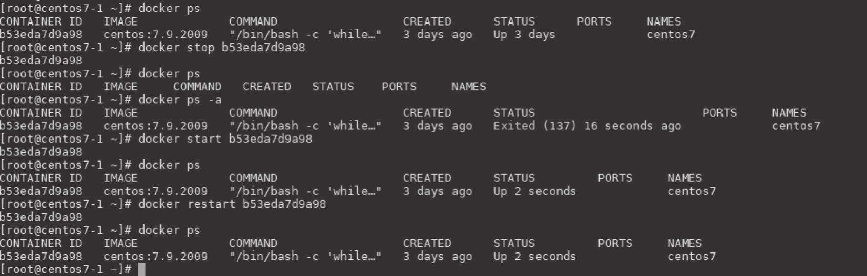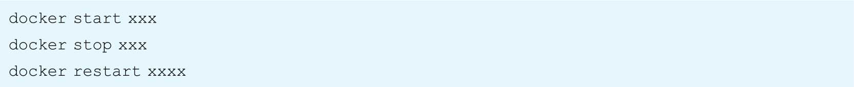 接下来继续学习容器的启动与停止,命令如下。其中start为启动容器,stop为停止容器,restart为重启容器,xxx为容器id。
