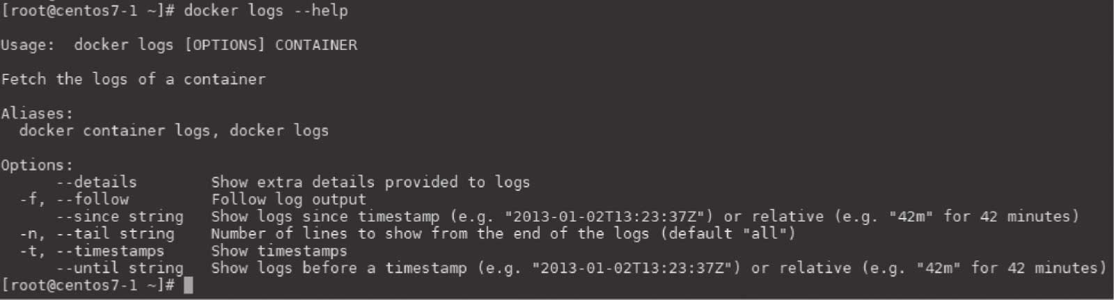 下面继续介绍查看容器日志的命令docker logs。我们可以通过docker logs -help命令查看docker logs命令的用法,如图2-68所示。