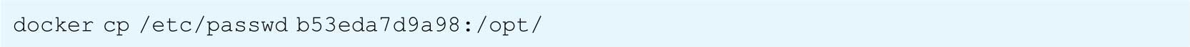 比如将虚拟机上的/etc/passwd文件拷贝到容器的/opt/目录下,则执行如下命令。其中容器id可以通过docker ps命令查询,这个命令前面已经介绍过了。