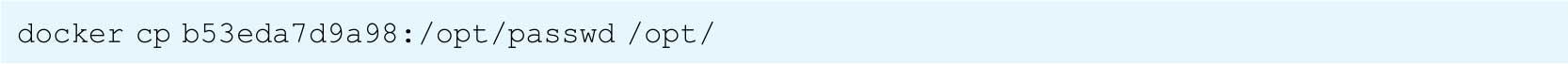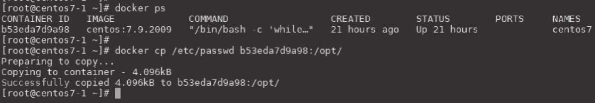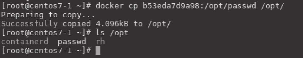 同理,如果需要继续将容器中的/opt/passwd文件拷贝到虚拟机的/opt/目录下,可以执行如下命令。