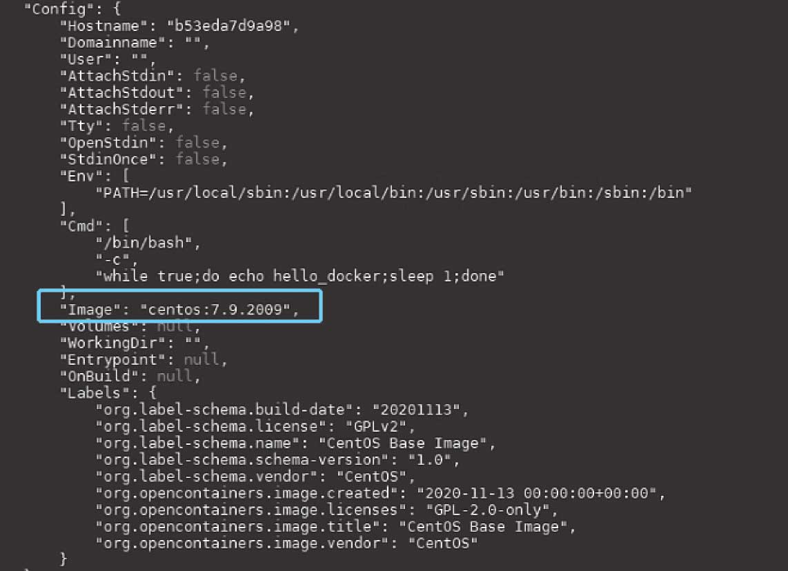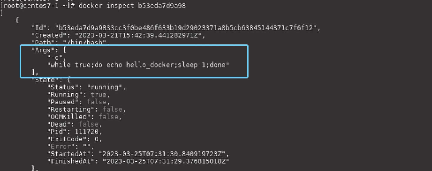 执行这个命令显示的内容比较多,可以看到容器在启动时执行的命令,如图2-72所示。下面将介绍几个常用的信息。