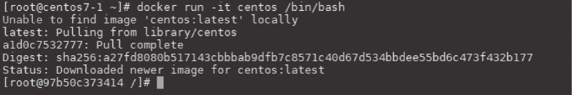 执行结果如图2-53所示。我们可以发现并没有直接使用本地存在的7.9.2009的centos镜像,而是下载了latest标签的镜像。这是因为在执行命令中没有指定centos的tag值,这一点和docke pull的处理方式是一致的,即当不指定具体tag值时,默认tag的值为latest。此外,因为本地不存在latest标签的centos镜像,所以在启动容器的时候会下载latest标签的centos镜像。通过提示符的不同,可以看出交互的shell不是虚拟机的shell了,已经进入docker容器了。