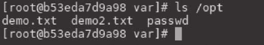然后在容器中查看/opt/目录下的文件列表,如图2-66所示。此时passwd文件已经在容器中的/opt/目录下了。