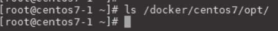 接下来,验证一下容器挂载目录的功能。首先重新打开一个新的虚拟机的shell,查看虚拟机上/docker/centos7/opt/目录下是否有文件,如图2-60所示。可以看到,此时虚拟机上/docker/centos7/opt目录是空的。