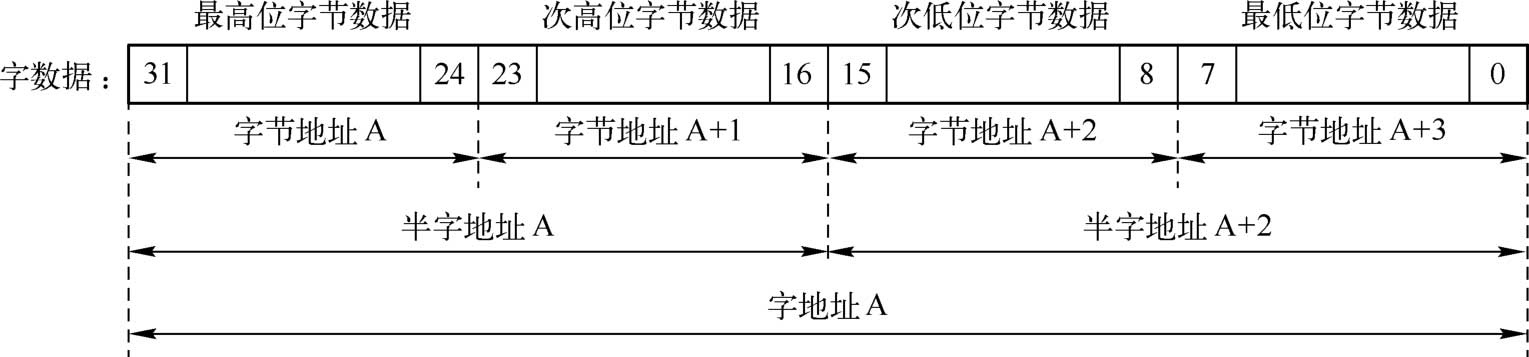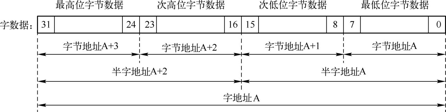 而小端存储与大端存储正好相反,它的定义是,将字数据的最高8位字节数据存放在字节地址最大的存储单元中,将字数据的最低8位字节数据存放在字节地址最小的存储单元中,如图2-3所示。