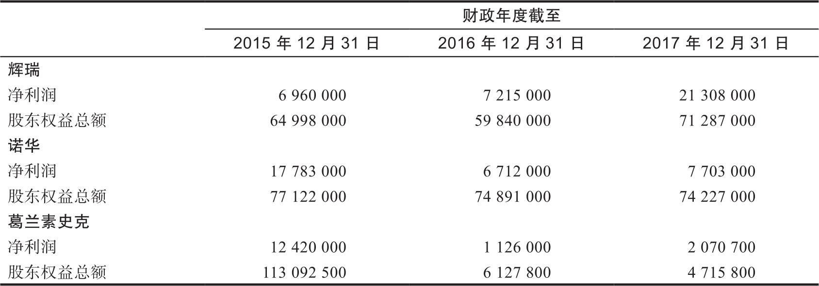 (blue chip,被认为财务状况良好且在各自行业或当地股票市场处于领先地位的被广泛持股的大市值公司)——辉瑞、诺华和葛兰素史克的净利润和股东权益账面总值的信息。数据为截至12月的2015年至2017年的财政年度。