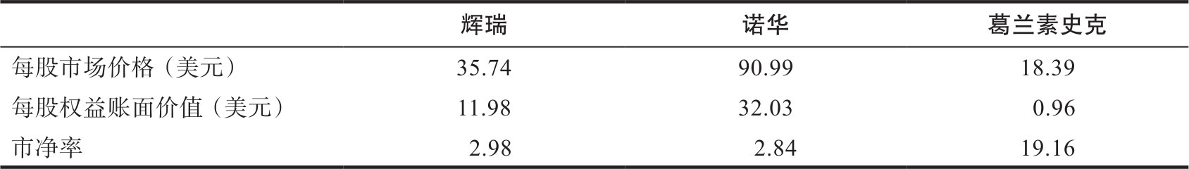 三家公司的每股市场价格均超过各自的账面价值,因此其市净率均大于1。但是,它们的市净率大小存在显著差异。葛兰素史克的市净率最大,而辉瑞和诺华的市净率相近。这表明投资者相信葛兰素史克的未来增长机会远高于辉瑞或诺华。
