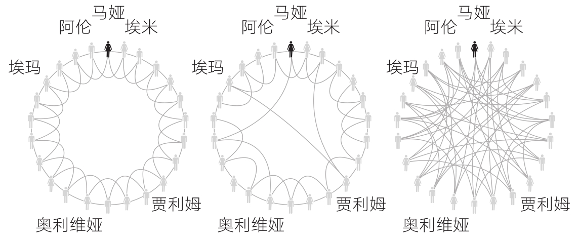 由最左侧到中间的圆盘,我们能看到个别邻里关系被去除了,这些关系被随机连接到了群体中的其他人身上。 25 过去,埃玛和贾利姆之间的关系隔了许多人,现在他们则有了直接联系。这些随机连接形成的“捷径”在网络中能到达的距离比原本的关系更远。有了这些长连接,原本要经过许多步才能从马娅传到奥利维娅的招聘信息,现在仅需两步就能传达到位。较疏远的人际关系变为了加速传播的渠道。