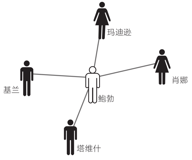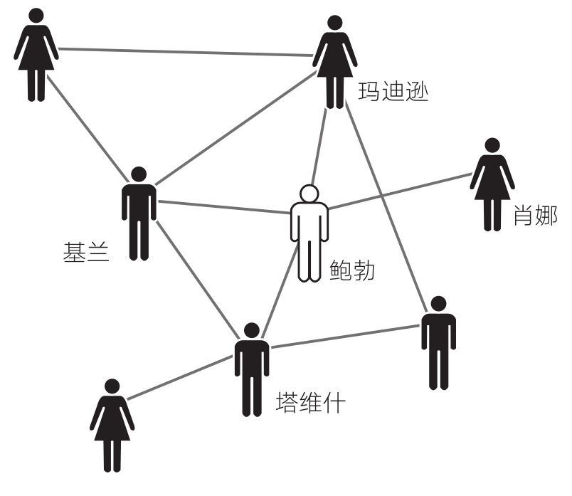 在图1-1中,社会网络的核心节点鲍勃有4个联系人,分别是玛迪逊、基兰、肖娜、塔维什。我们通过观察鲍勃联系人的特征,就能对鲍勃的人际交往模式有一定了解。鲍勃的朋友多是男性、女性,还是性别焦虑人群?他的朋友和他同属一个人种吗?他的朋友都属于同一人种还是混血?鲍勃的经济状况、政治信仰和朋友们类似吗?