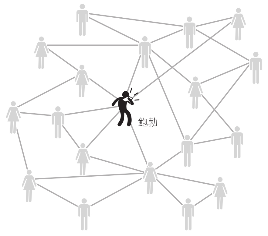 马克·格兰诺维特对弱连接的研究为社会网络和传播的研究带来了重大突破。格兰诺维特的弱连接理论建立在德国社会学家格奥尔格·西梅尔(Georg Simmel)等人的观点之上,他强调,要理解人际网络在社会传播中的作用,就必须跳出自我中心网络。 17 要理解鲍勃的观念和行为,只观察与鲍勃有联系的人是不够的,还要观察与鲍勃的朋友有联系的人。