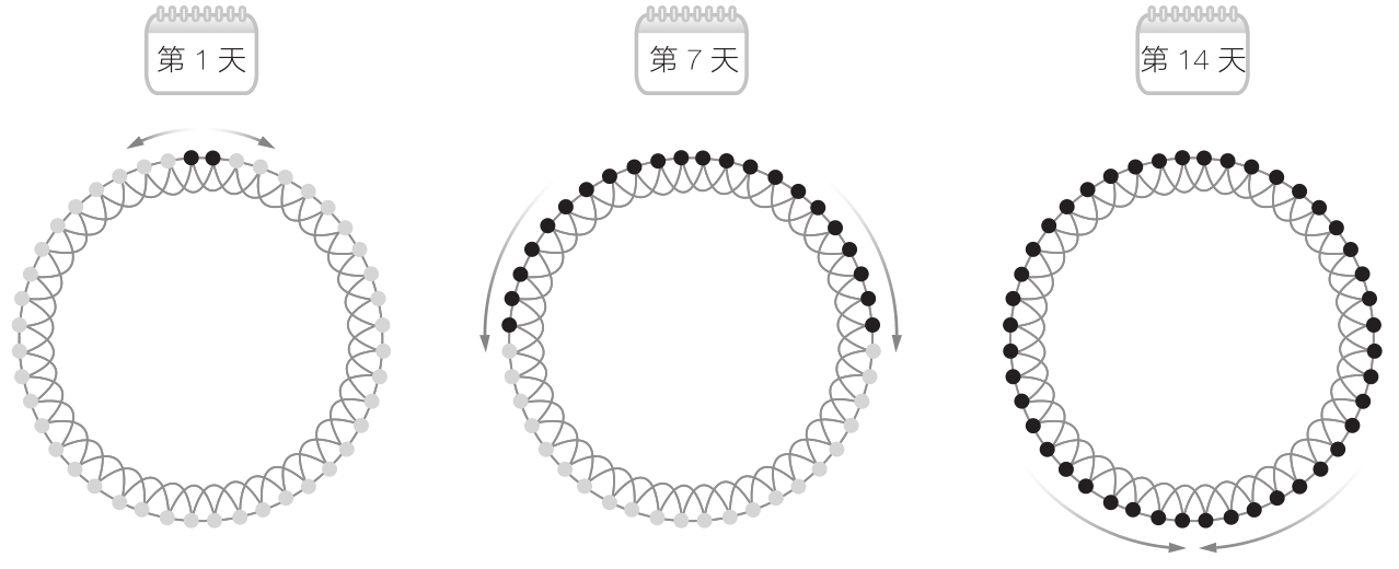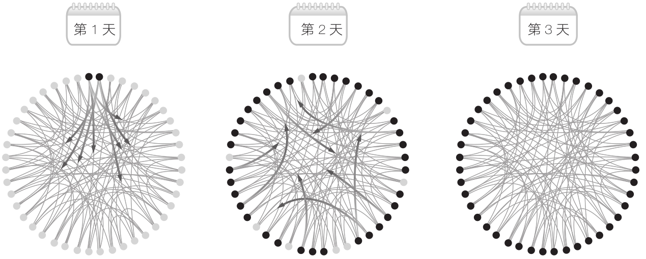 在图1-7和图1-8中,每个人都有4个联系人,2个在左侧,2个在右侧。在图1-9中,传播过程开始后,信息由种子节点发出,传给其两侧的联系人。然后,这些联系人将信息传给他们的联系人,以此类推,信息将传遍整个网络。最终,口头传播用了14天才将信息传向一个又一个街区,最终传遍整个群体。