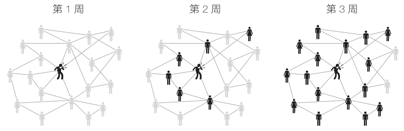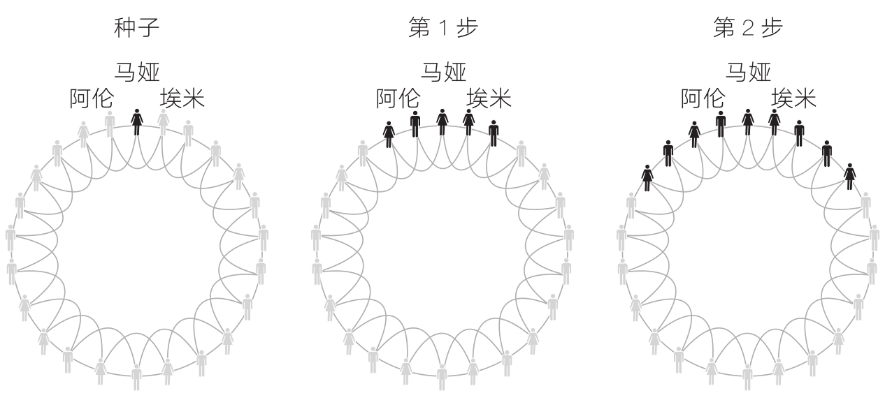 图1-7就是这样一个例子。最左侧圆盘中涂黑的小人是马娅,她要招一名编程人员,想通过自己的“口头传播”网络将这一招聘信息传播出去。这张图展现了马娅的招聘信息在一个群聚型网络中的传播过程。在这一网络中,每个人都有4个联系人,2个在左侧,2个在右侧。在最左侧的圆盘中,马娅作为“种子”开启了传播过程。她把招聘信息告诉了她所有的熟人,并让他们把这个信息传播给他们所有的熟人,以此类推。中间的圆盘展示了这一传播过程的第1步,马娅激活了4个直接联系人,这些人也被涂成黑色。最右侧的圆盘为第2步,马娅的每个联系人都将招聘信息告诉了他们的每个联系人。理想情况下,马娅的“口头传播”网络中会出现病毒式传播,这会让她轻松找到合适的员工。