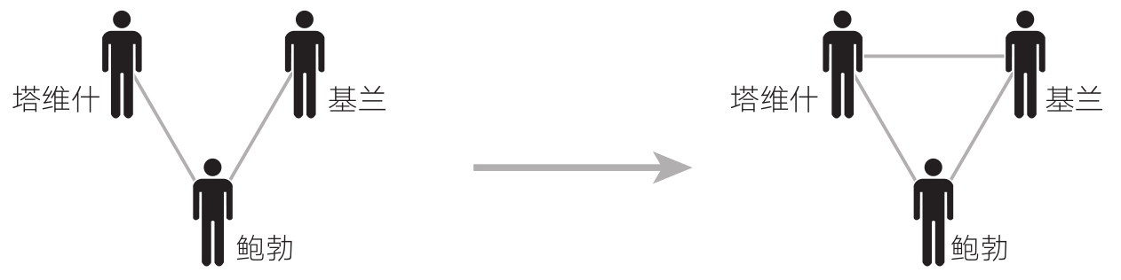 格兰诺维特发现,如果两个人各自和第三个人存在强连接,那这两个人之间很可能也有连接。形成这一结构规律的原因如下:第一,我们一般和熟人有共同点,这些熟人之间一般也有共同点,因此他们很可能结成关系;第二,我们一般和强连接对象处在相同的社会情境中,比方说,我们可能常去同一座教堂、住同一片社区、上同一所学校等,因此我们的强连接对象一般也处在相同的情境中,很可能经常见面。更重要的是,因为我们经常与熟人互动,所以这些熟人可能也在一起互动。如图1-6所示,鲍勃与塔维什、基兰的关系越近,塔维什和基兰的关系就可能越近,这令他们成为关系密切的三人组。 23