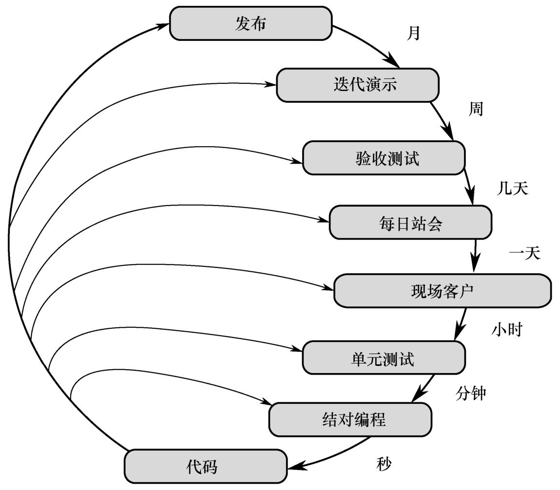 在不同的敏捷实践中,都强调了及早进行价值验证与确认,如在XP(极限编程)中,从各维度提供了不同级别的反馈循环,如图2-20所示。