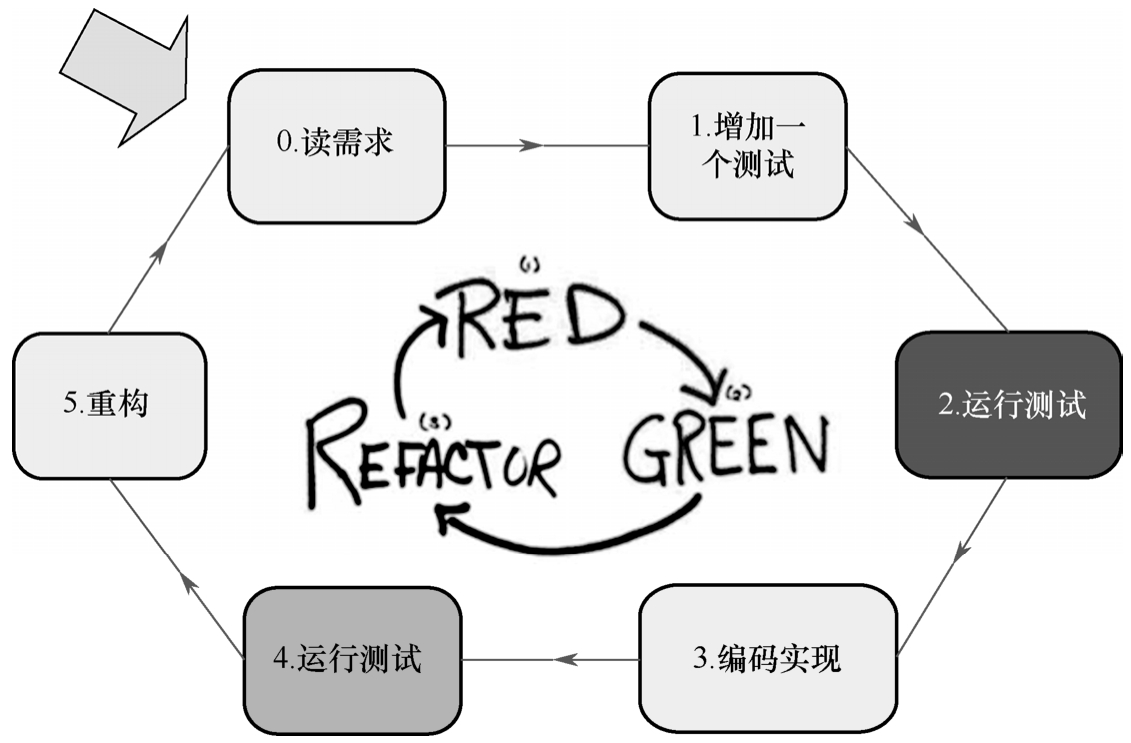 测试驱动开发(Test-Driven Development,TDD)也称为测试先行编程(Test-First Programming),在改变任何产品代码之前先编写一个自动化单元测试代码,由于它要测试的产品功能代码还不存在,所以,会运行失败(红灯),然后编写产品功能代码使测试通过(绿灯),在单测保护下,再对代码进行重构,如图2-23所示。